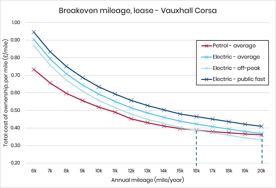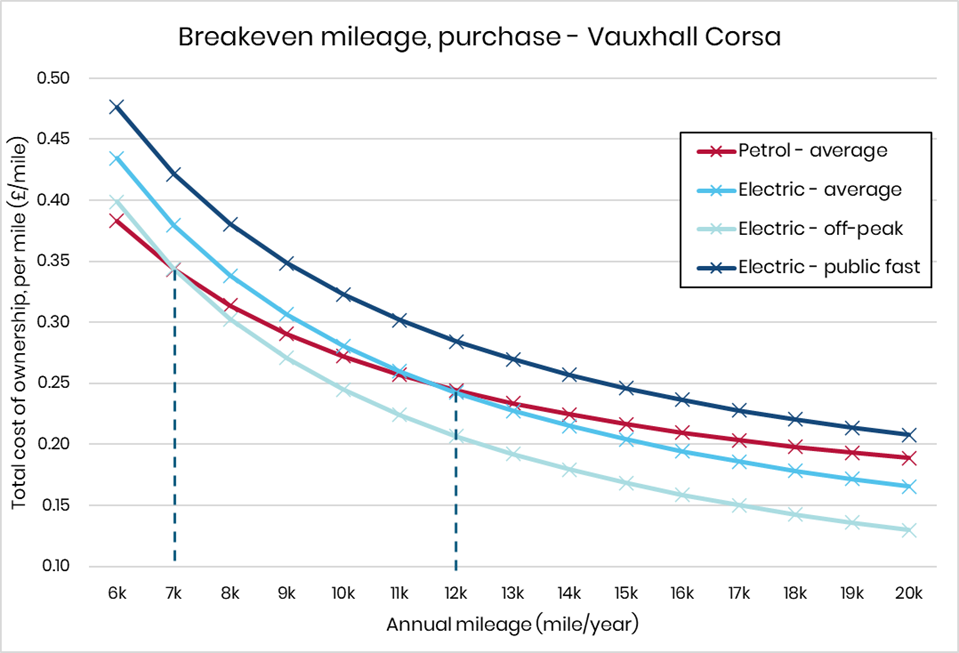 As BEVs generally have a higher upfront cost but lower running cost than ICE vehicles, the amount of mileage the car makes can have a big impact on the TCO comparison. The following graphs show the TCO per mile based on the number of miles the vehicle runs per year. The higher the annual mileage, the lower the cost per mile for ICE and BEVs, but the BEV cost reduces more significantly. This means that at higher annual mileage, the BEV TCO can be lower than the ICE TCO.